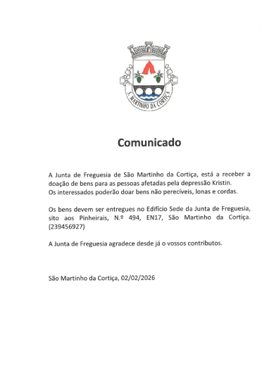 A Junta de Freguesia de São Martinho da Cortiça, está a receber a doação de bens para as pessoas afetadas pela depressão Kristin. |