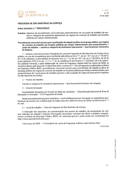 A indicação dos requisitos, métodos de seleção e demais informação necessária, constam da oferta publicada integralmente na Bolsa de Emprego Público (BEP), em www.bep.gov.pt e pode ainda ser consultada no separador Conteudos - Junta de Freguesa - Avisos, em http://www.saomartinhocortica.pt/. |