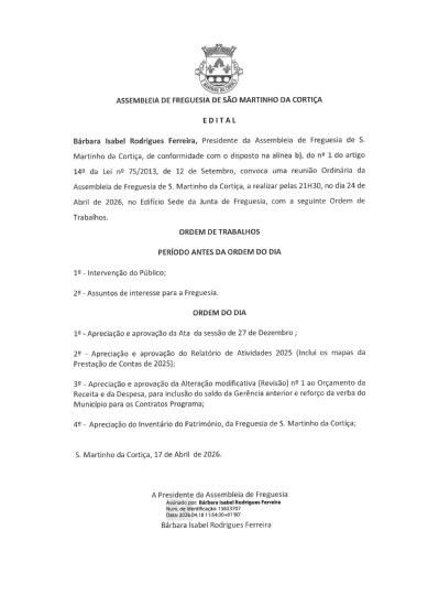 No próximo dia 24 de Abril pelas 21:30 horas, no Edificio Sede da Junta de Freguesia será realizada a reunião de Assembleia de Freguesia. |